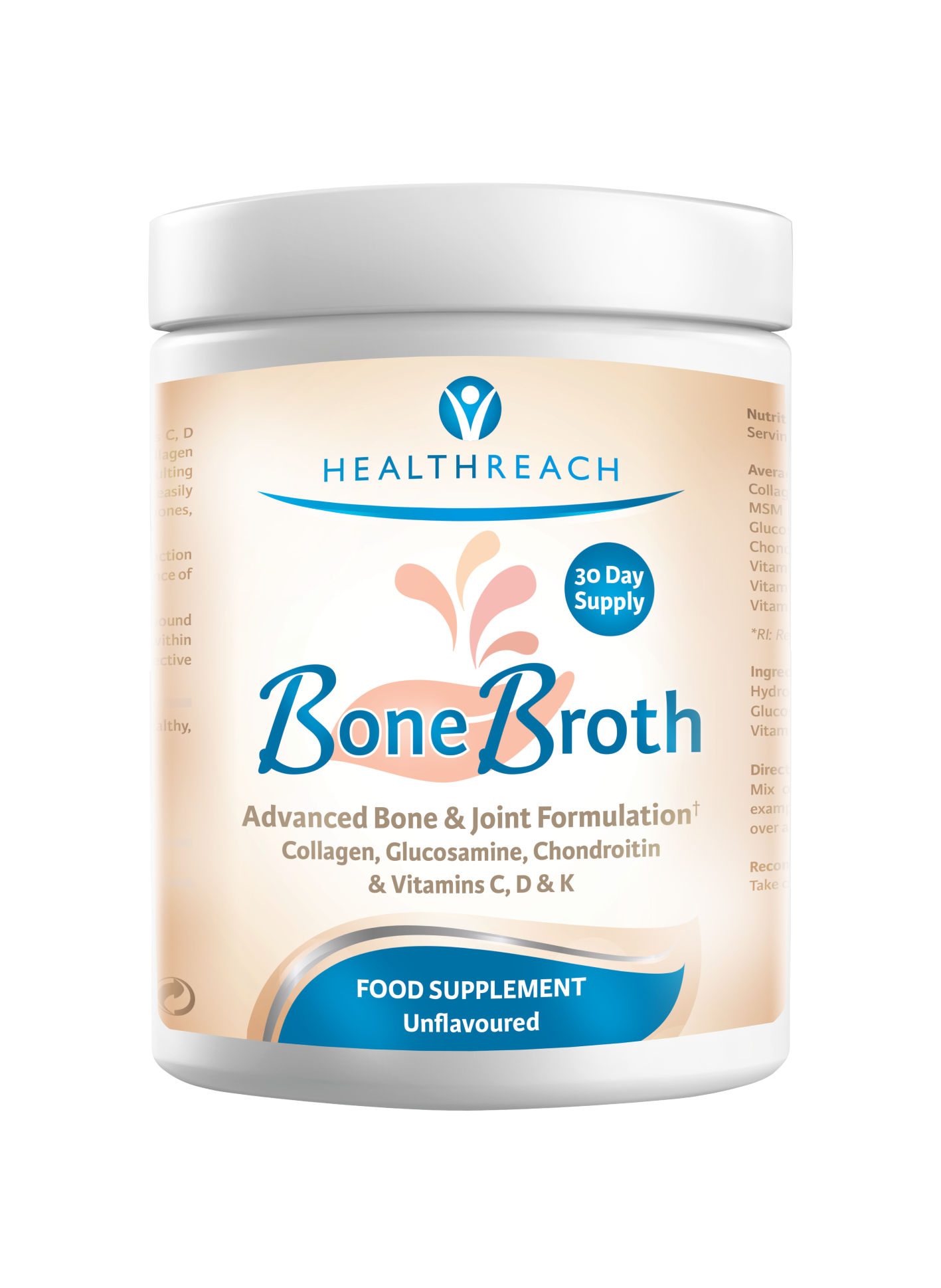 Healthreach Bone Broth also contains Vitamin C which contributes to normal collagen formation for the normal function of bones and cartilage and Vitamins D and K to contribute to the maintenance of normal bones.